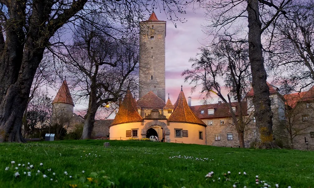 Im majestätischen Burggarten öffnen sich bezaubernde Aussichtskanzeln zur linken und rechten Seite mit herrlichen Panoramablicken über das malerische Taubertal. Richtung Norden entdeckt man den charmanten Ortsteil Detwang mit seiner einzigartigen Kirche, die den Holzaltar von Tilman Riemenschneider beherbergt – hier wurde Rothenburg erstmals im Jahr 960 erwähnt.